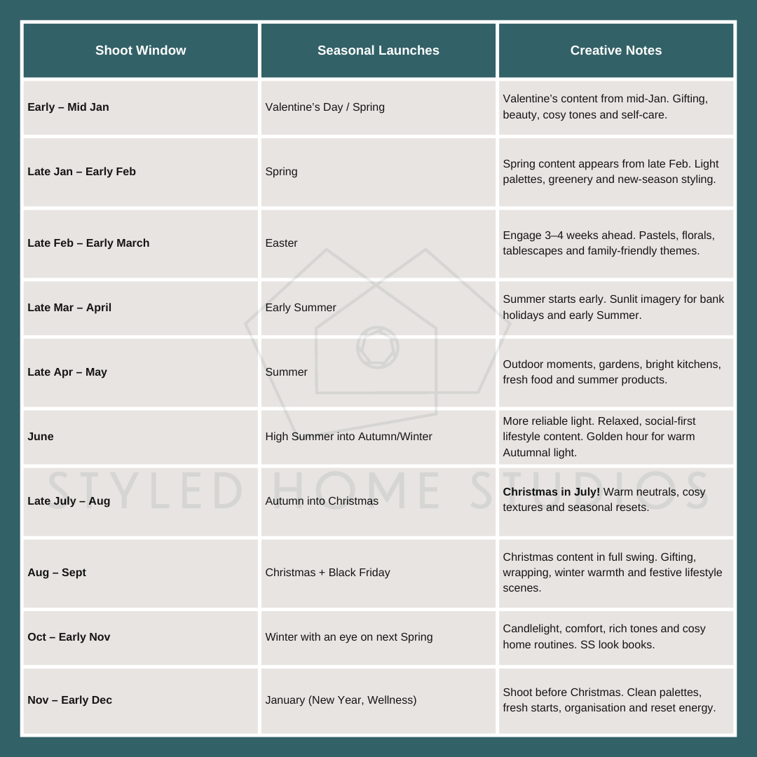 Knowing when to shoot is just as important as what you’re shooting so here’s our seasonal, easy-to-follow breakdown of when you should be planning and executing your brand’s photoshoots throughout the year, including key dates, holidays and ideal moments for bulk content creation.